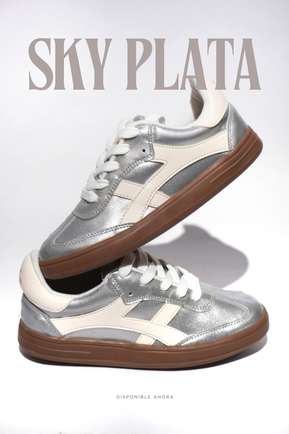 Los Sky Plata son ese par de tenis que combina con todo: jeans, faldas, vestidos o lo que más te inspire.